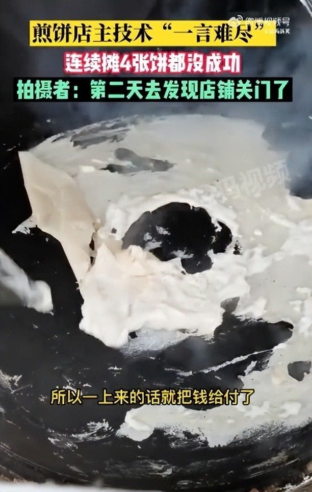 9月10日,湖北襄阳。女孩爱吃杂粮煎饼,直接先付了钱等老板摊饼。没想到煎饼店主技术“一言难尽”,连续摊4张饼都没成功:第二天去发现店铺关门了,说是休息几天。